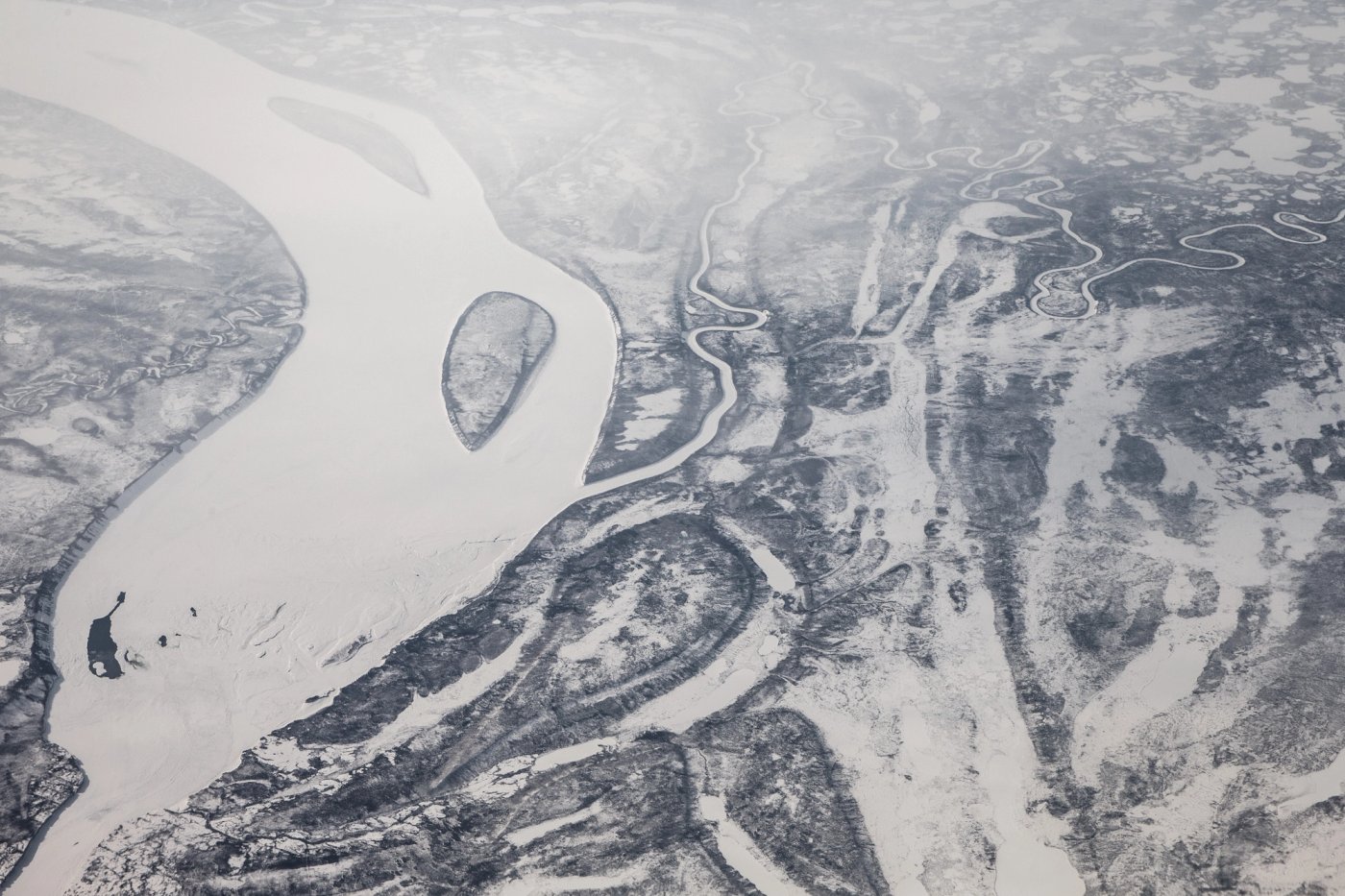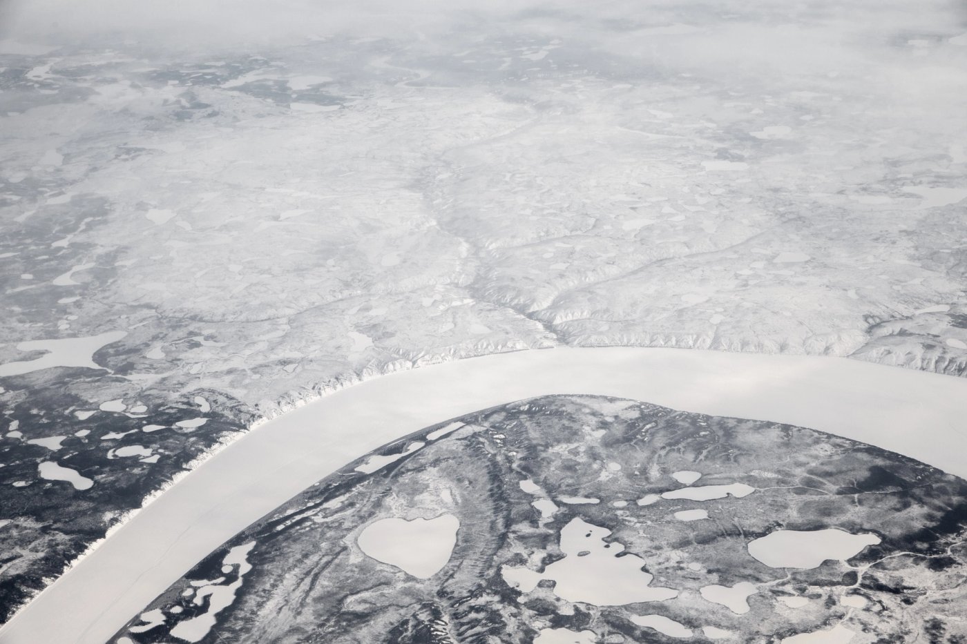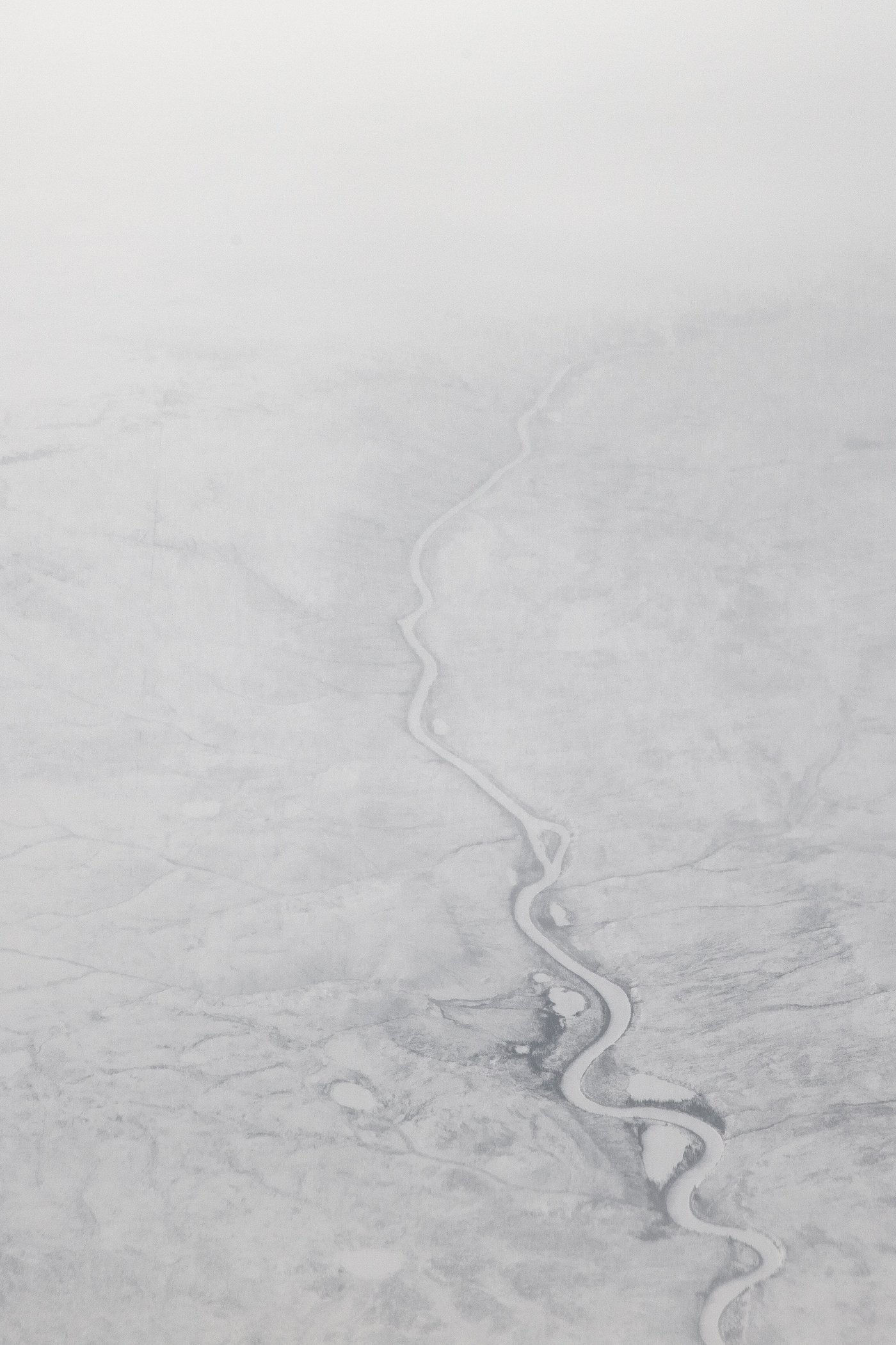 From above, the world simplifies into essentials: white immensity, slow water meanders, faint scars of ice, and the quiet geometry of distance.
