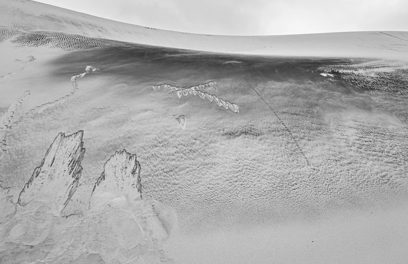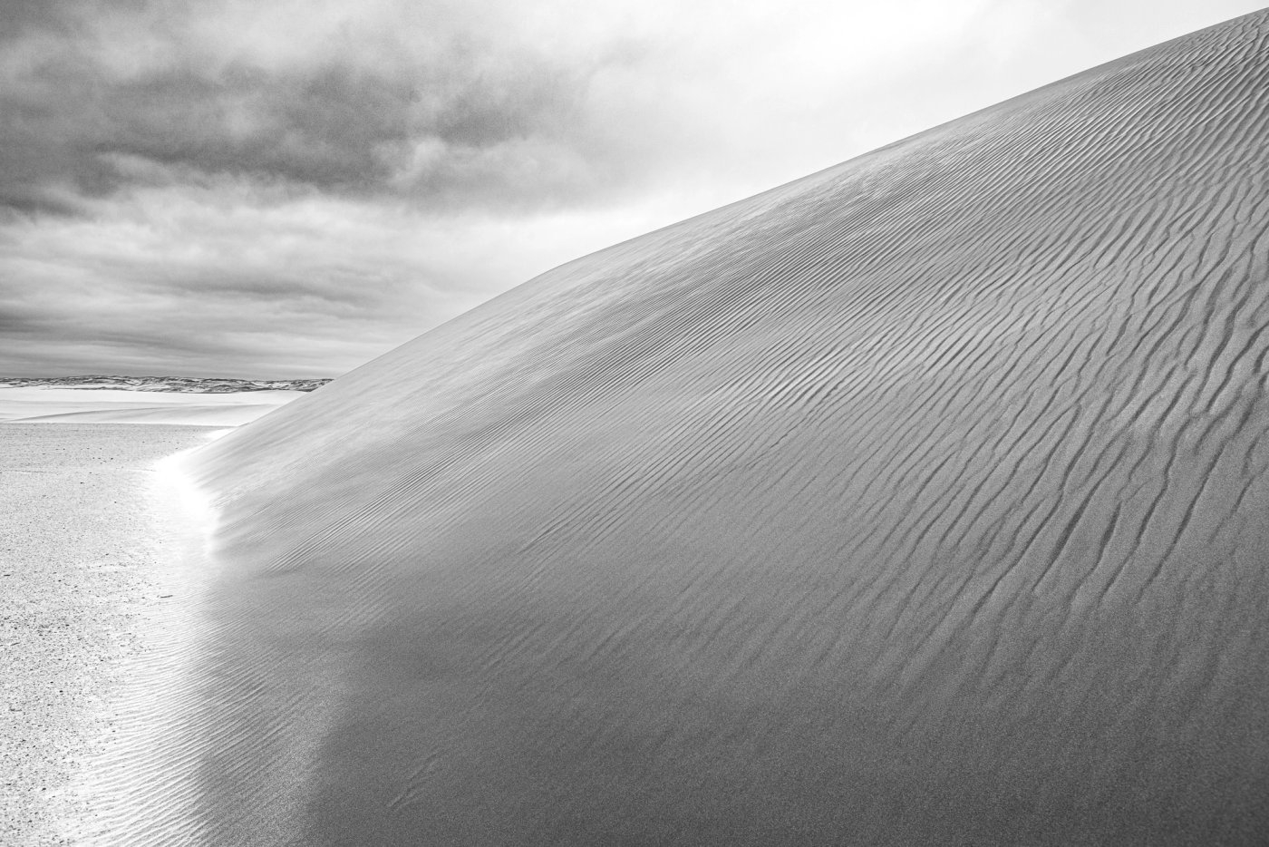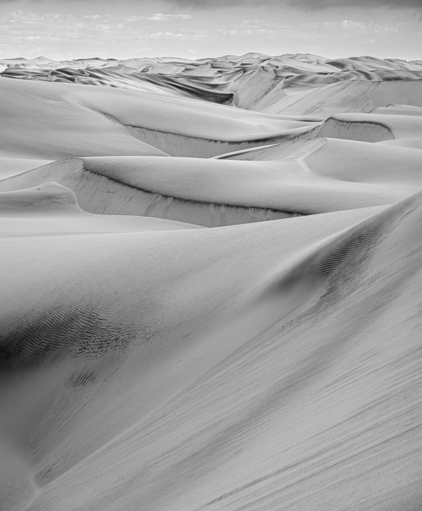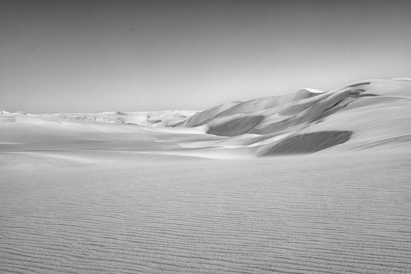 Here the wind lifts the sand like crystalline dust and lays it back down in new sentences, hour after hour. Ridges sharpen, bowls soften, lines disappear, then return somewhere else. The landscape becomes impossible to rely on, because the map is always late.